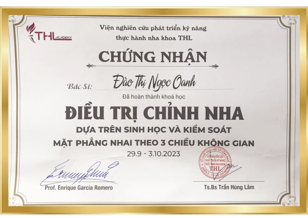 - Chỉnh nha chuyên sâu: Chứng chỉ Invisalign (Hoa Kỳ), Chứng chỉ Bioprogressive và đặc biệt là kỹ thuật Meaw (GEAW) – phương pháp tiên tiến điều trị các ca cắn hở, hạng III mà không cần phẫu thuật.