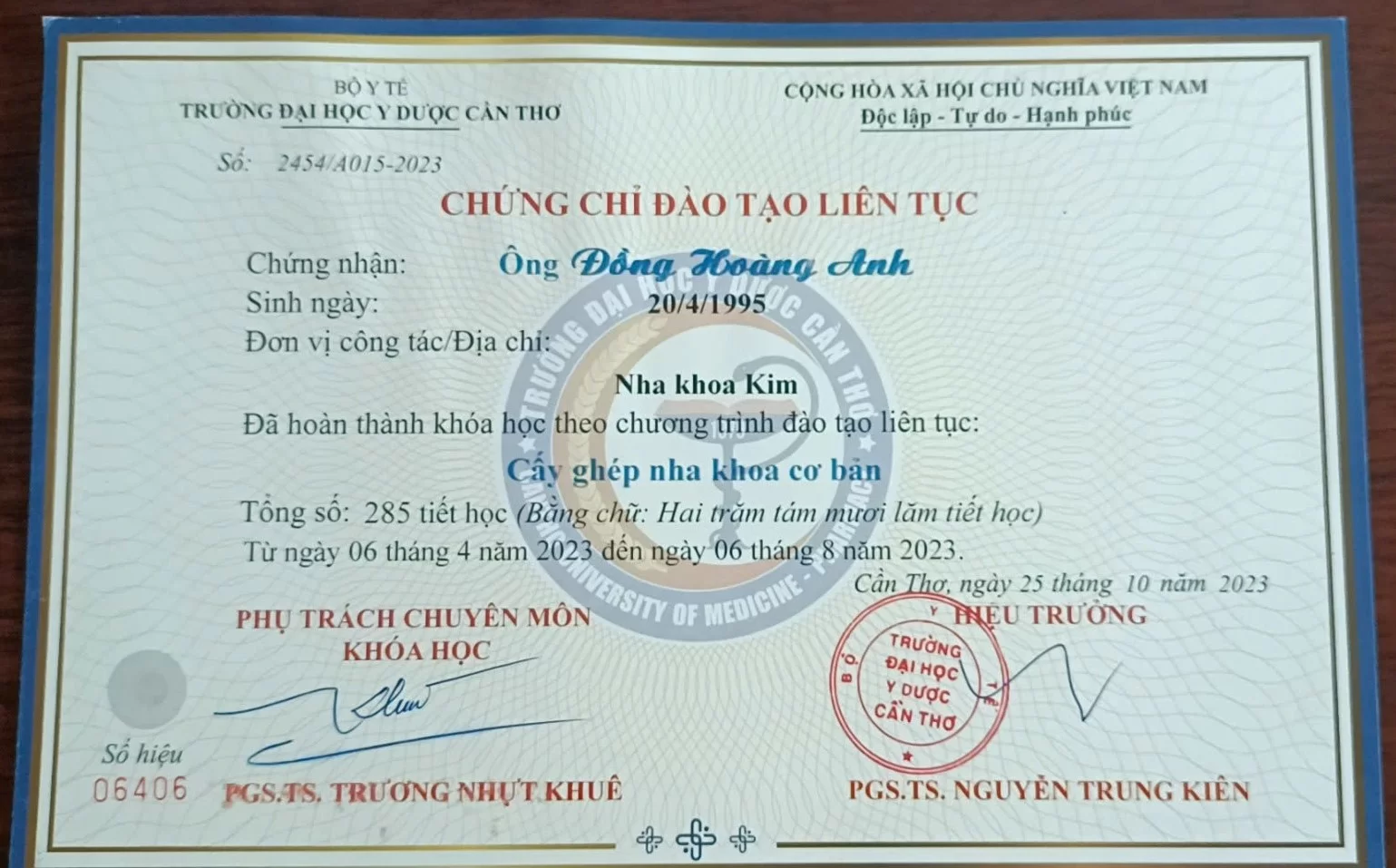 Năm 2023, bác sĩ đã hoàn thành khóa học và được cấp Chứng chỉ Implant. Đây là một trong những kỹ thuật phục hình răng phức tạp nhất hiện nay, đòi hỏi bác sĩ phải am hiểu sâu về cấu trúc giải phẫu xương hàm và mô mềm.