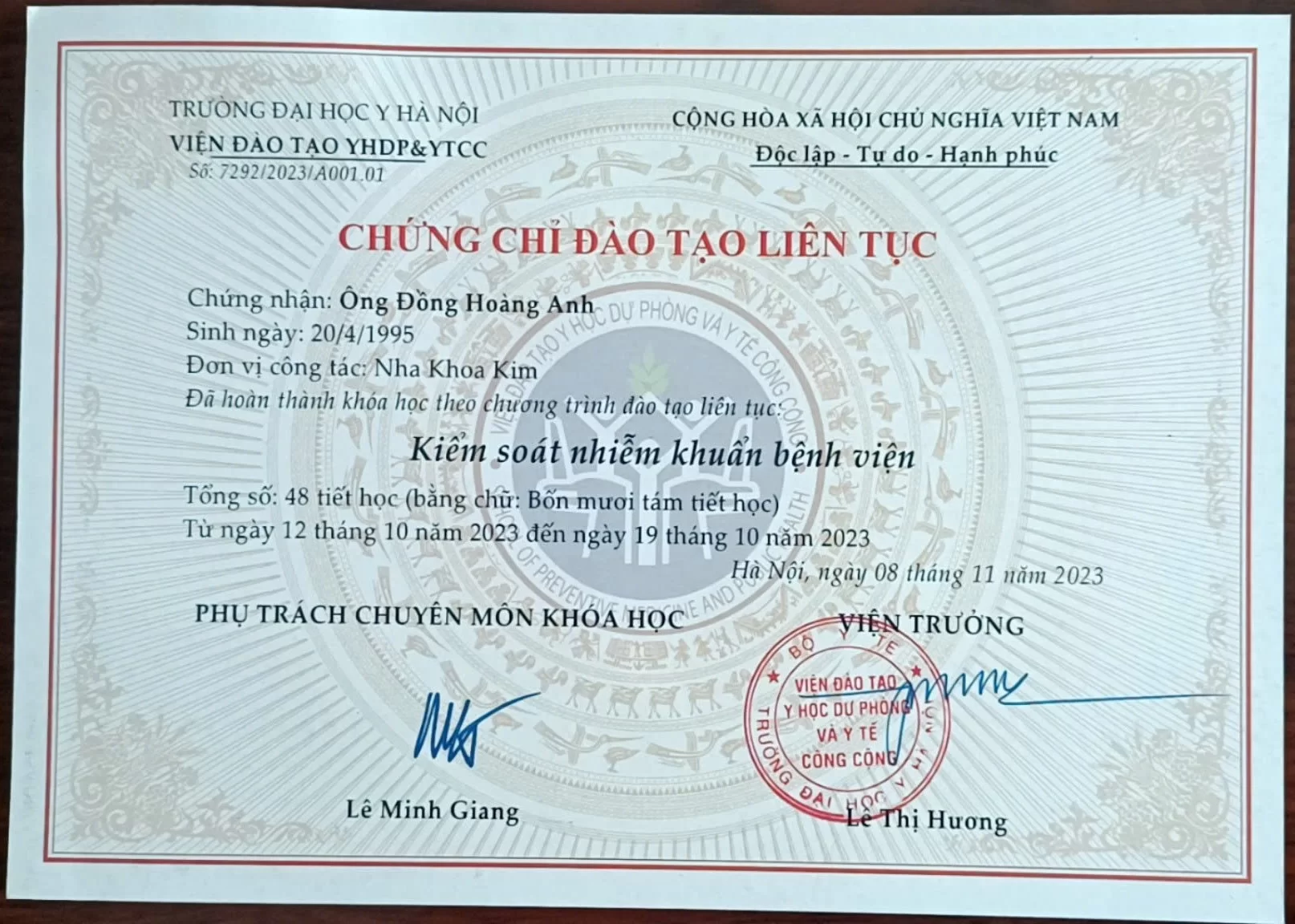 Song song với kỹ thuật điều trị, bác sĩ đặc biệt chú trọng đến an toàn y tế thông qua việc đạt Chứng chỉ Kiểm soát nhiễm khuẩn vào năm 2023. Kiến thức này giúp bác sĩ thiết lập và duy trì quy trình vô trùng nghiêm ngặt trong mọi ca điều trị.