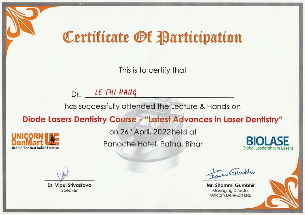 - Công nghệ Laser trong chỉnh nha: Tốt nghiệp chương trình ứng dụng Diode Laser, trực tiếp thụ giáo từ Giáo sư Vipul Srivastava, làm chủ kỹ thuật kiểm soát mô mềm và tối ưu hóa quá trình điều trị.