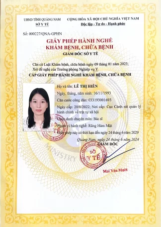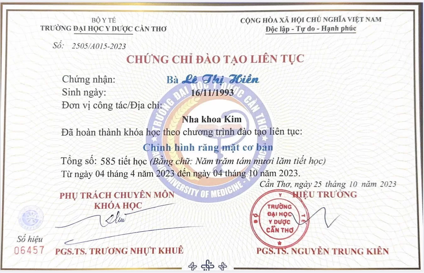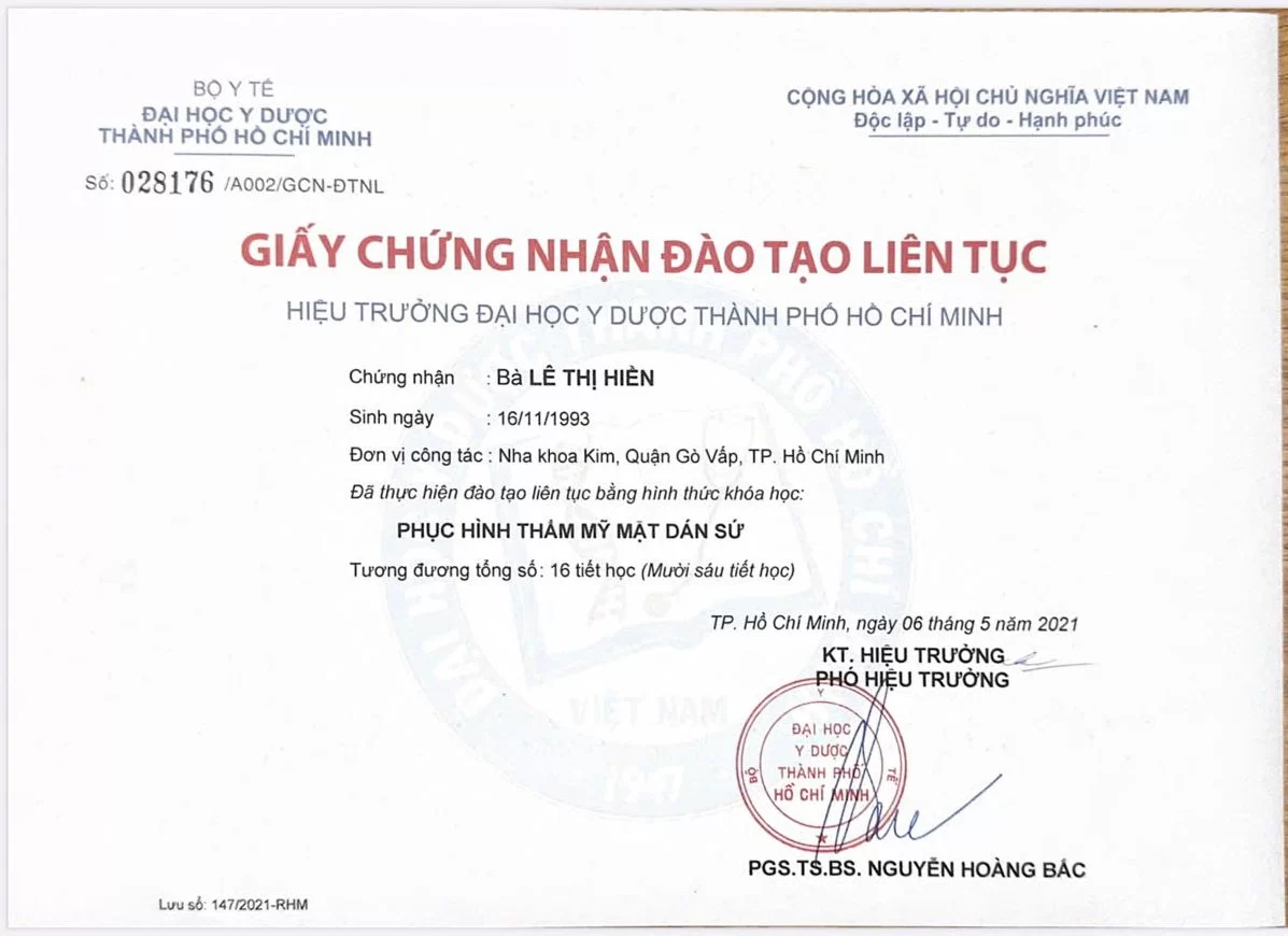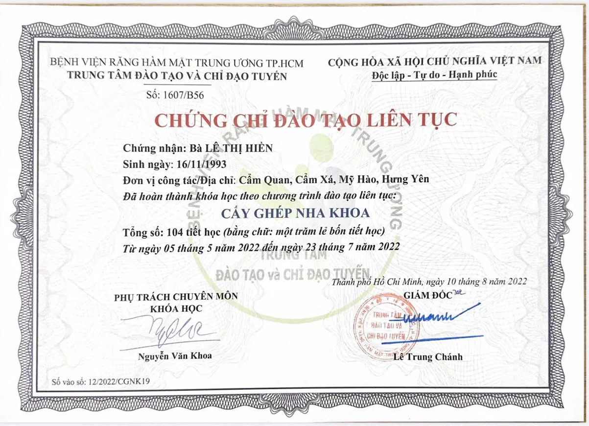 Lựa chọn điều trị cùng một chuyên gia có học vị cao và chứng chỉ chuyên sâu là bảo chứng cho kết quả thẩm mỹ mỹ mãn. Với trình độ chuyên môn vượt trội và sự tận tâm, Bác sĩ Lê Thị Hiền cam kết mang lại giải pháp nha khoa toàn diện. Hy vọng thông tin về hồ sơ chuyên môn trên đã giúp bạn an tâm khi gửi gắm niềm tin để tìm lại nụ cười rạng rỡ.
