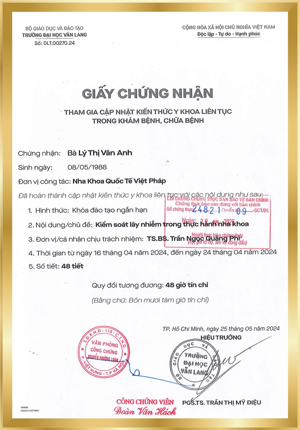 - Chứng chỉ Cắm ghép Implant nha khoa đạt chuẩn chuyên môn của Đại học Y Hà Nội.