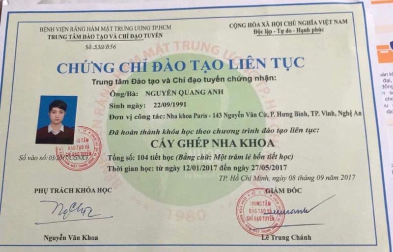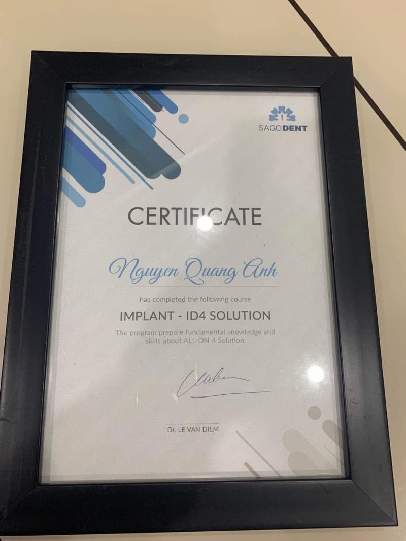 - Chứng chỉ Implant nha khoa (Bệnh viện Răng Hàm Mặt Trung Ương TP.HCM).