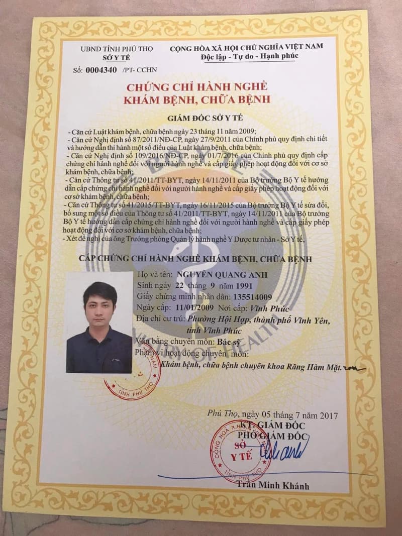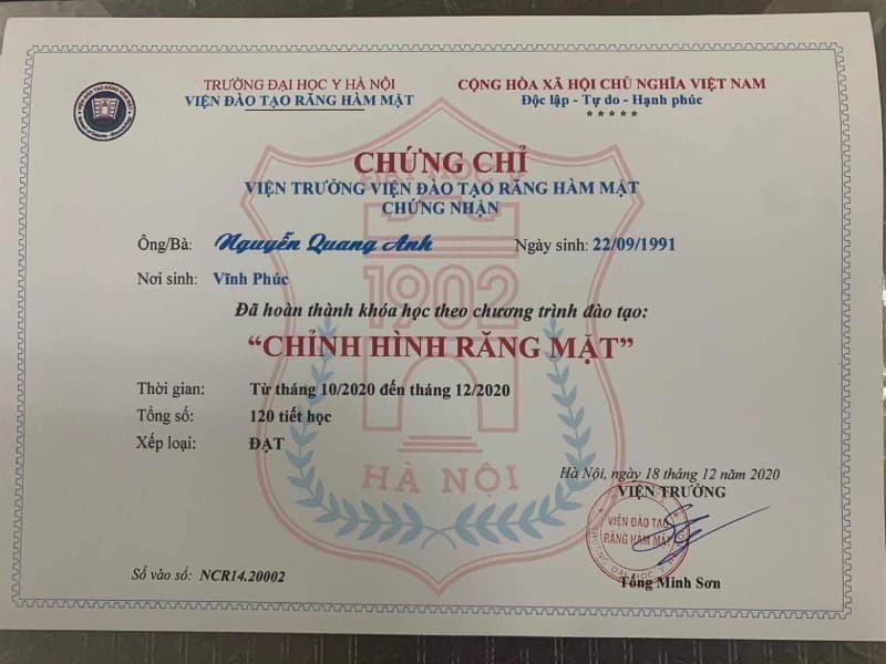 - Chứng chỉ chỉnh nha (Đại học Y Hà Nội).