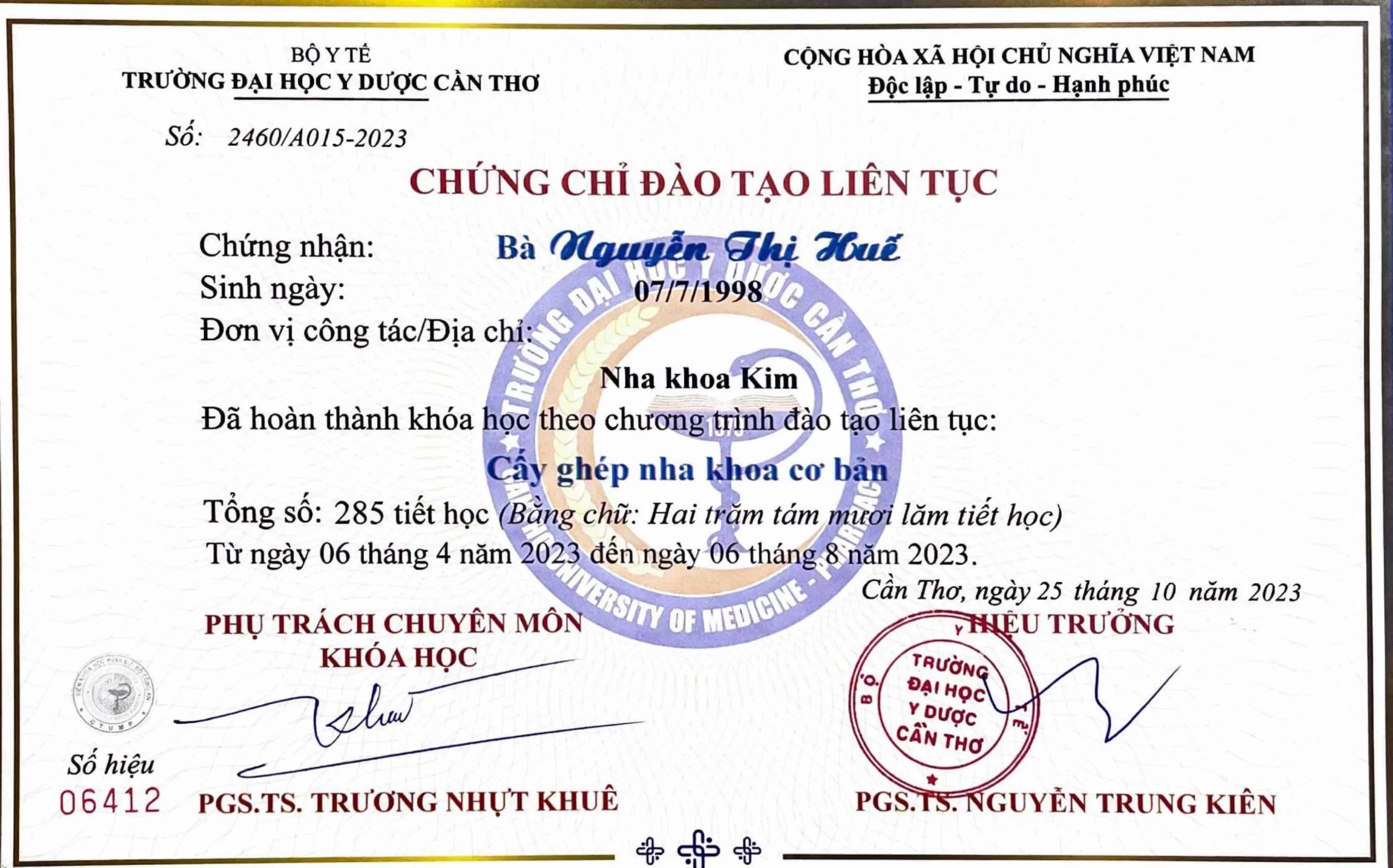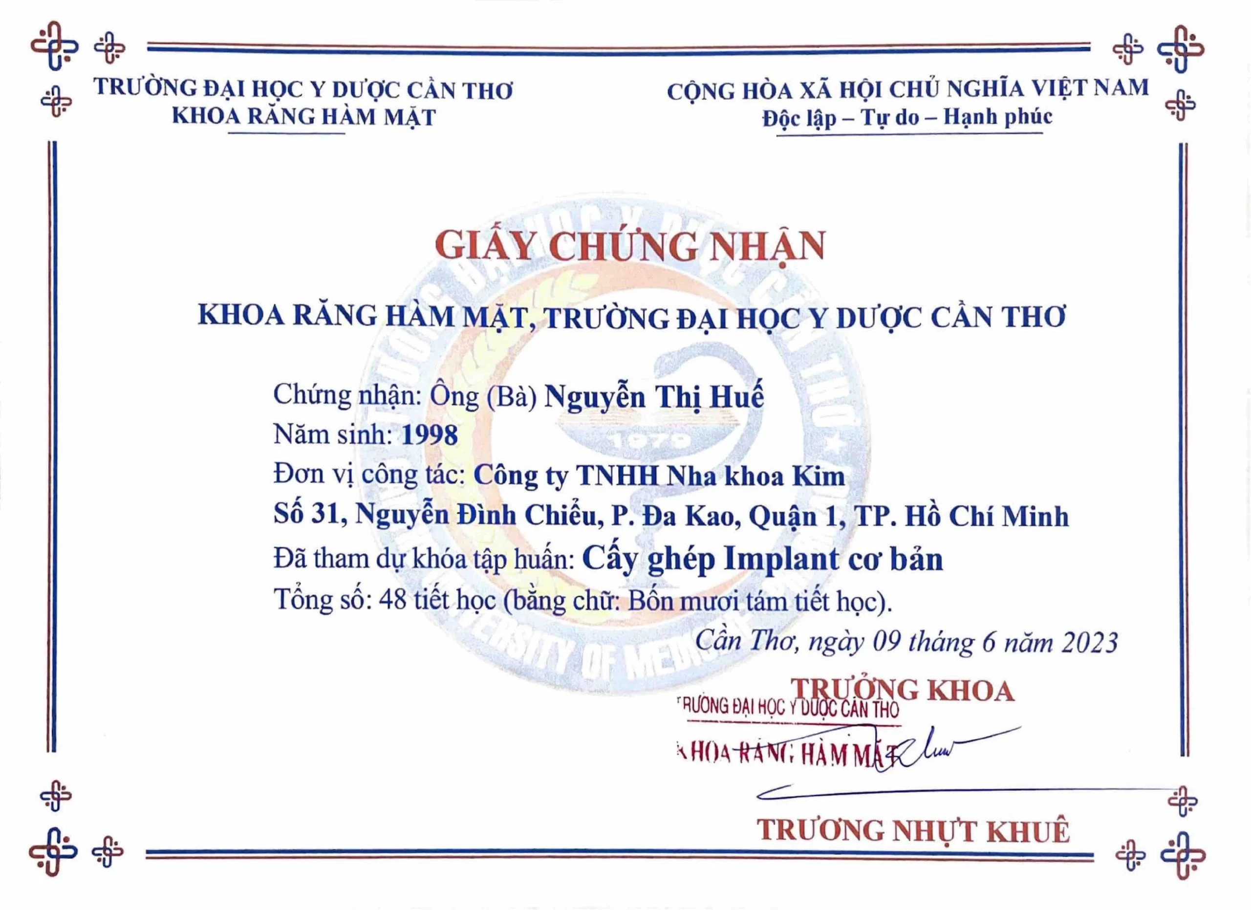 • Chứng chỉ Cấy ghép Implant (2023): Xác nhận năng lực thực hiện các kỹ thuật phục hồi răng mất bằng công nghệ Implant hiện đại, đảm bảo tính thẩm mỹ và chức năng.