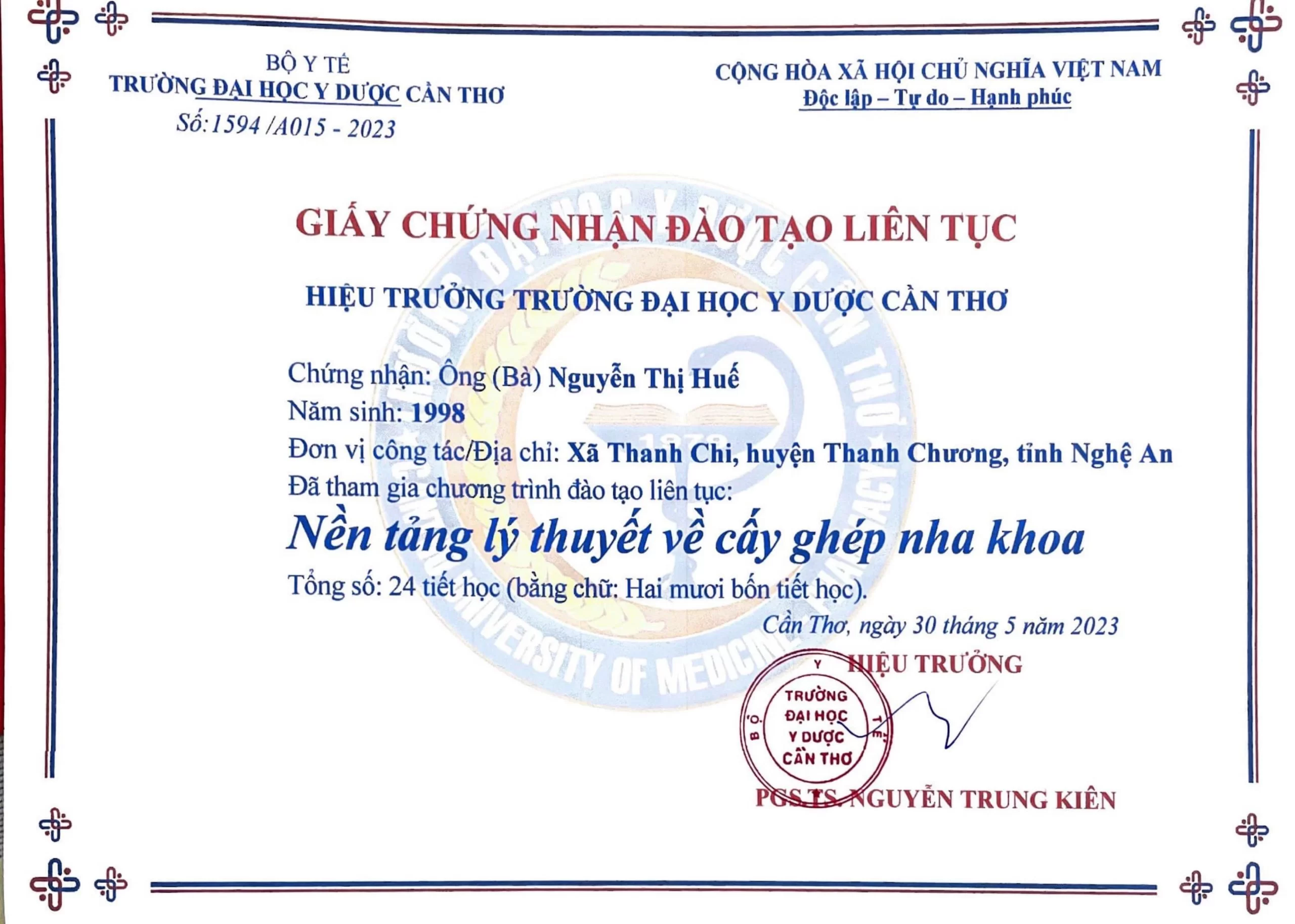 Hồ sơ chuyên môn Thạc sĩ – Bác sĩ Nguyễn Thị Huế Chuyên gia Implant