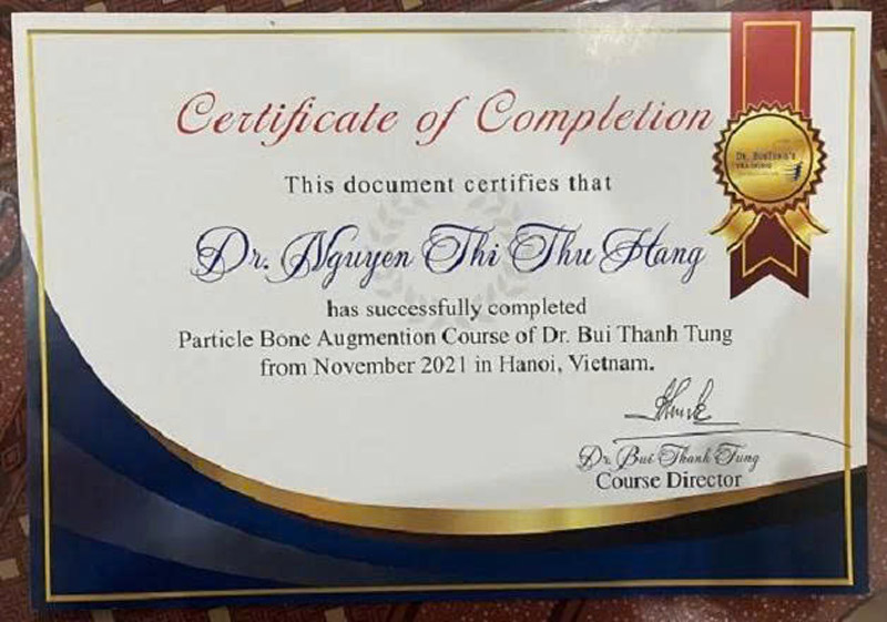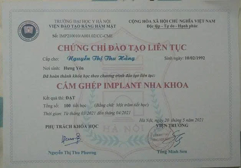 - Chứng chỉ Cấy ghép Implant từ Đại Học Y Hà Nội.