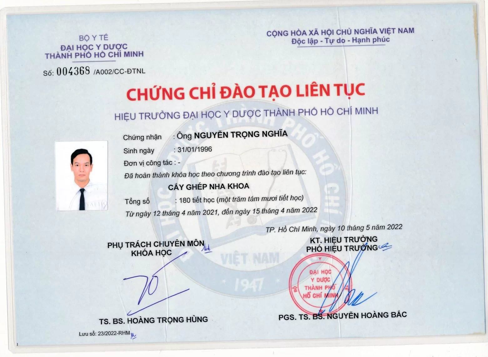 Không dừng lại ở kiến thức đại học, bác sĩ tiếp tục nâng cao tay nghề với Chứng chỉ Cấy ghép Implant vào năm 2021. Chứng nhận này khẳng định năng lực pháp lý và chuyên môn của bác sĩ trong việc thực hiện các kỹ thuật cấy ghép phức tạp, giúp khôi phục răng mất một cách toàn diện.