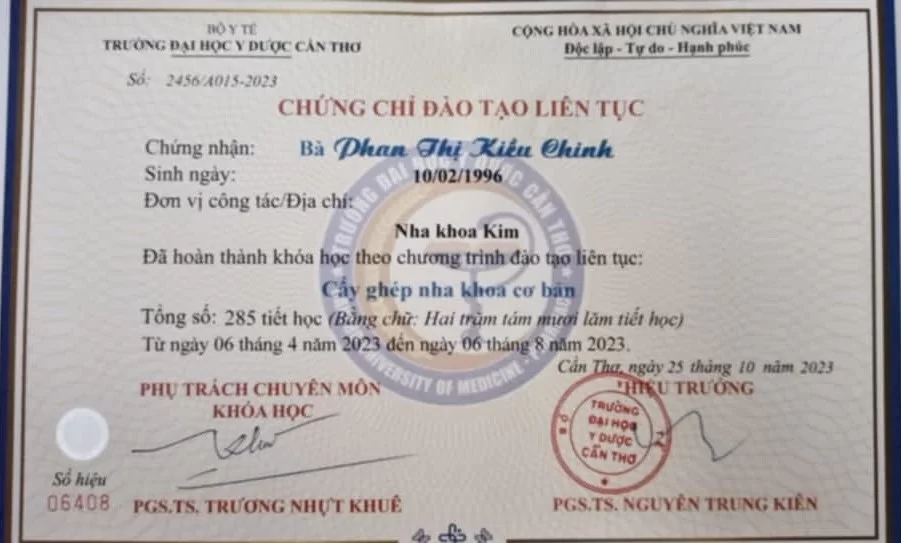 Năm 2023, bác sĩ đã xuất sắc hoàn thành khóa học và nhận Chứng chỉ Implant. Chứng nhận này khẳng định năng lực trong lĩnh vực cấy ghép nha khoa, một kỹ thuật phức tạp đòi hỏi độ chính xác cao để phục hồi răng mất.