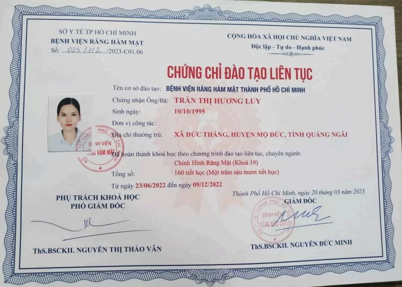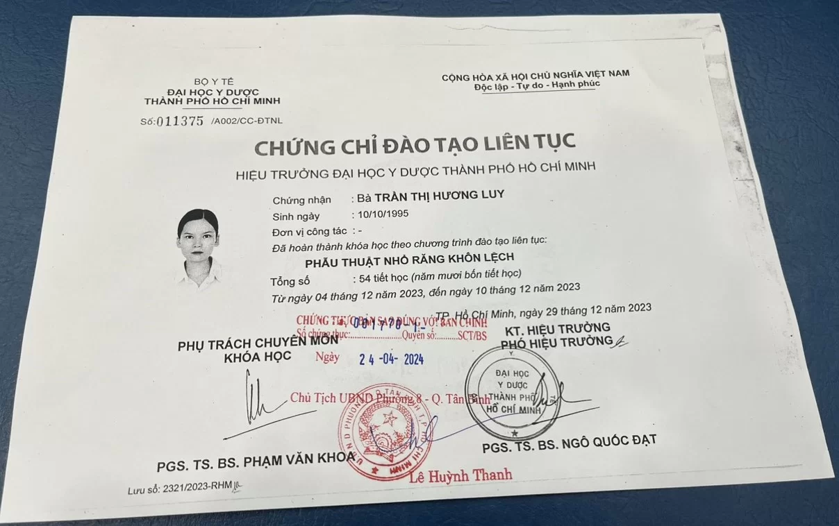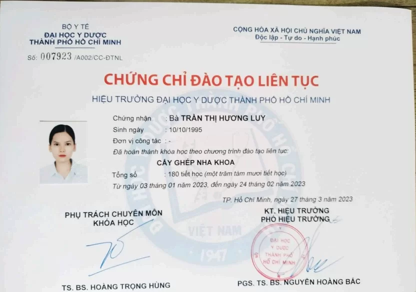 Với nền tảng từ Đại học Y Dược TP.HCM cùng hệ thống chứng chỉ chuyên sâu cập nhật mới nhất năm 2024, Bác sĩ Trần Thị Hương Luy là sự lựa chọn tin cậy cho mọi nhu cầu nha khoa. Khả năng xử lý đa dạng từ Implant, chỉnh nha đến phẫu thuật nha chu giúp bác sĩ mang lại kết quả điều trị hoàn hảo. Hy vọng những thông tin trên đã giúp bạn an tâm hơn khi gửi gắm nụ cười cho bác sĩ.