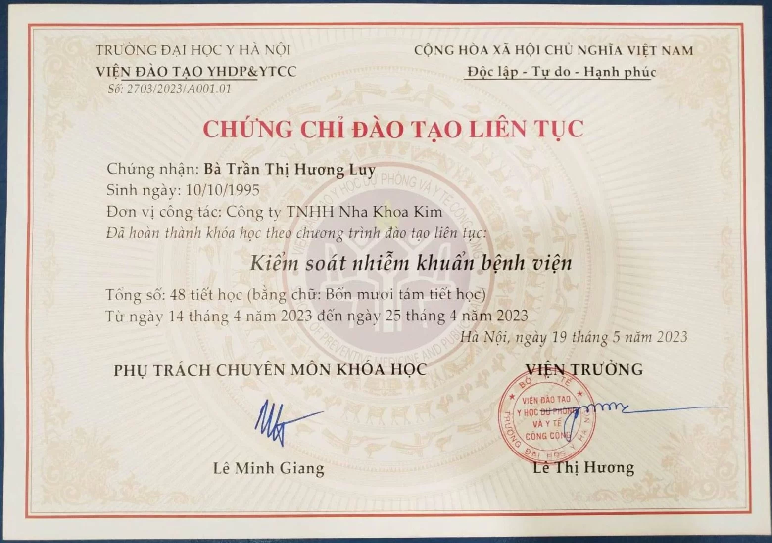 Trong năm 2023, bác sĩ đã đạt được hai chứng chỉ quan trọng là Cấy ghép nha khoa (Implant) và Nhổ răng khôn. Điều này khẳng định năng lực của bác sĩ trong việc thực hiện các ca phẫu thuật phục hồi răng mất và xử lý các ca răng khôn mọc lệch, mọc ngầm phức tạp.