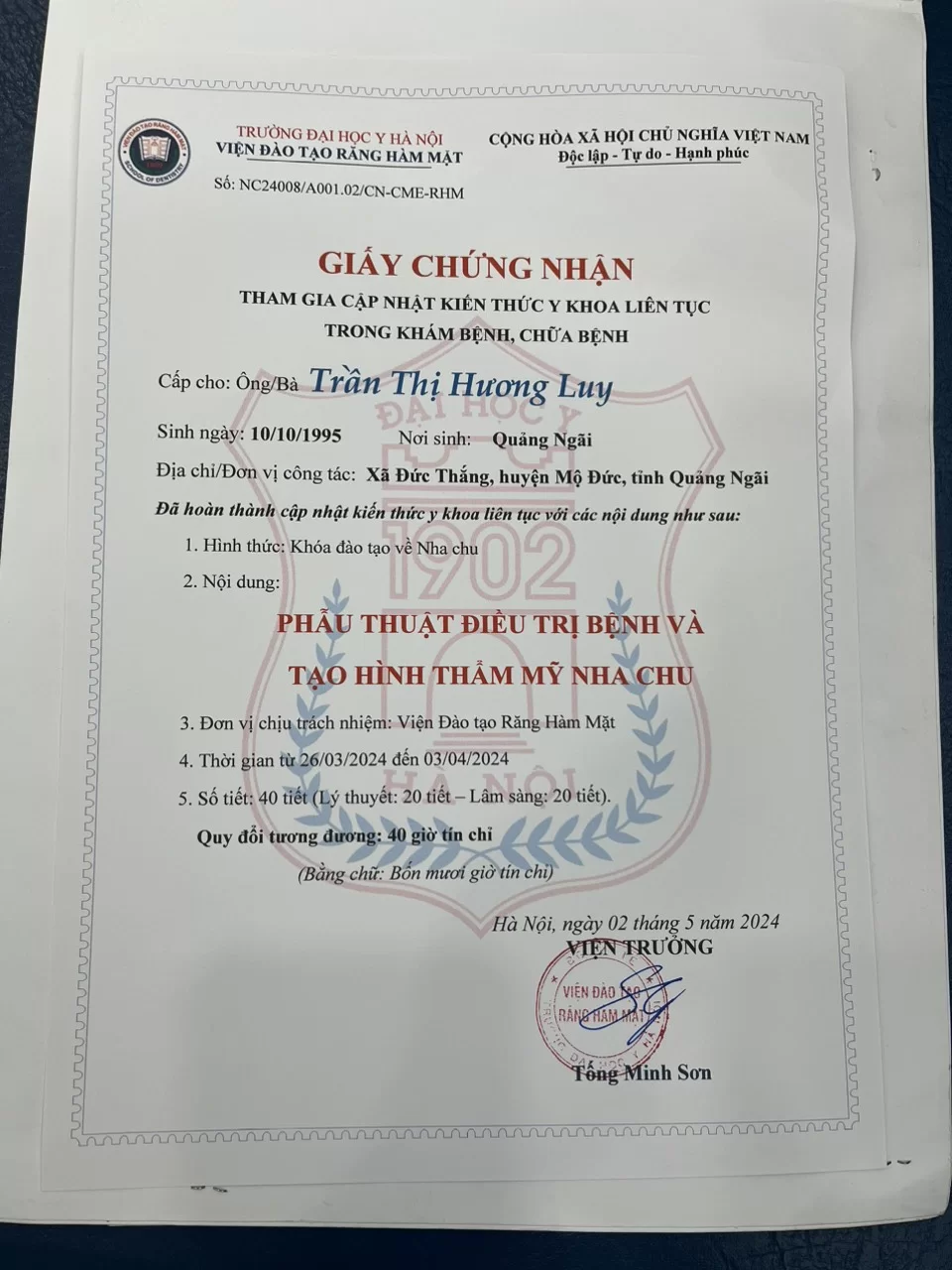 Năm 2024, bác sĩ tiếp tục nâng cao tay nghề với Chứng chỉ Phẫu thuật điều trị bệnh và tạo hình thẩm mỹ nha chu. Kỹ năng này cho phép bác sĩ điều trị hiệu quả các bệnh lý quanh răng và thực hiện phẫu thuật làm dài thân răng để cải thiện thẩm mỹ nụ cười.