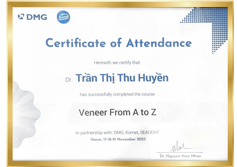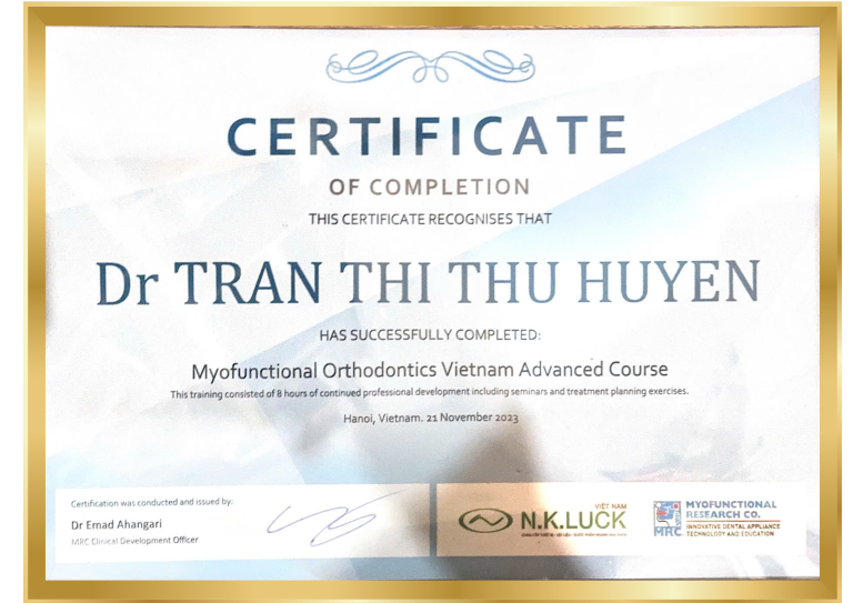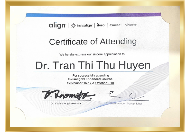 Bác sĩ liên tục hoàn thiện tay nghề thông qua các chứng chỉ quan trọng trong ngành nha khoa đương đại. Nổi bật là chứng chỉ Chỉnh nha không mắc cài Invisalign (Hoa Kỳ), khẳng định năng lực xử lý các ca niềng răng trong suốt phức tạp. Ngoài ra, bác sĩ còn làm chủ các kỹ thuật dây thẳng và khí cụ hỗ trợ nong hàm thông qua các khóa đào tạo chỉnh nha mắc cài chuyên sâu.